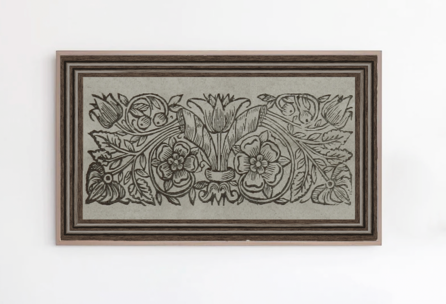 Our Woodblock Print with a Vintage Frame is a digital print for your Frame TV.  The vintage frame is not a physical frame, but integrated into the artwork to give the illustion of a frame on your frame TV.   This art is a neutral blend of brown, gray, ivory and black and white in both striking and soft lines to create an upscale modern aesthetic for any room.